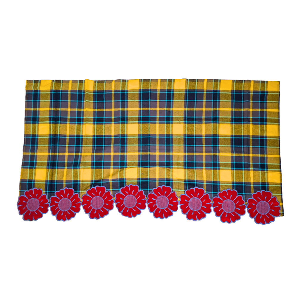 🌻 Geel-geruite pangi mofo met rode bloemenrand – Zonneschijn, kracht en vrouwelijkheid in één 150cm X 85cm🌻