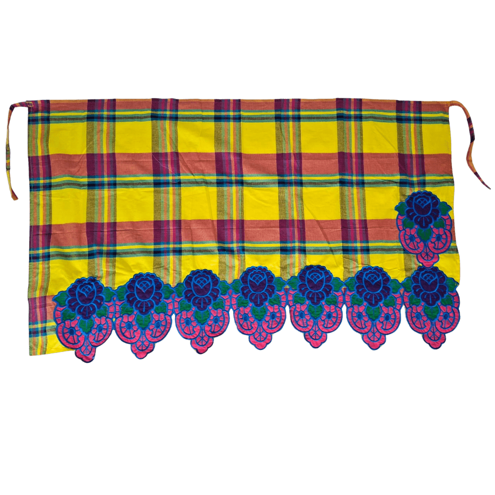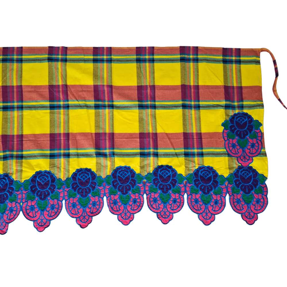 Deze pangi mofo is een levendige ode aan de Afro-Surinaamse vrouw: krachtig, stijlvol en diep geworteld in haar tradities. De doek is vervaardigd uit een klassieke pangistof in warme gele en roodbruine tinten, prachtig in balans gebracht met een verfijnde, geborduurde bloemenrand in koninklijk blauw en fuchsiaroze.