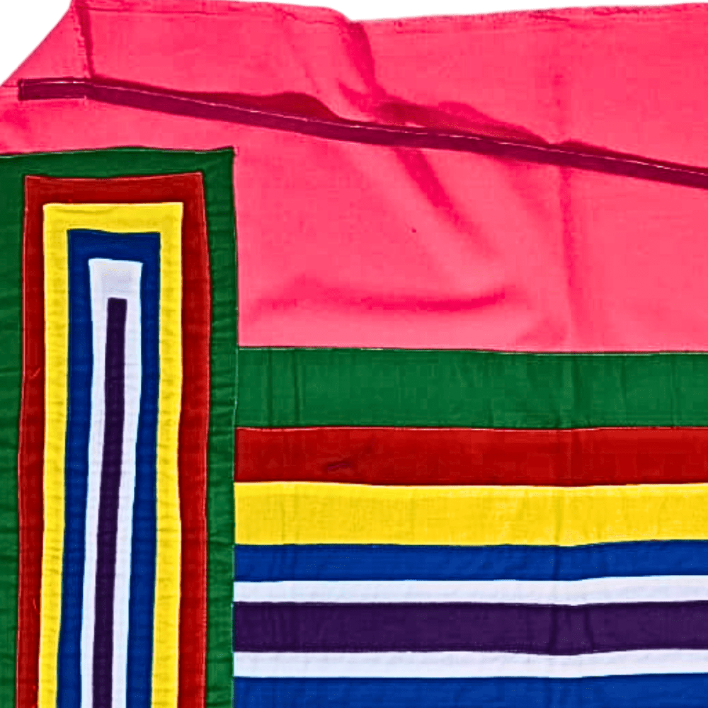 Deze unieke en opvallende pangi is een waar kunstwerk van kleur, structuur en betekenis. Met een dominante fuchsiaroze basis en een schitterende geometrisch opgebouwde patchworkrand in diverse kleuren, is dit een stuk dat lef, traditie én moderne expressie combineert. Ideaal voor de vrouw die haar culturele trots draagt met een creatief randje.