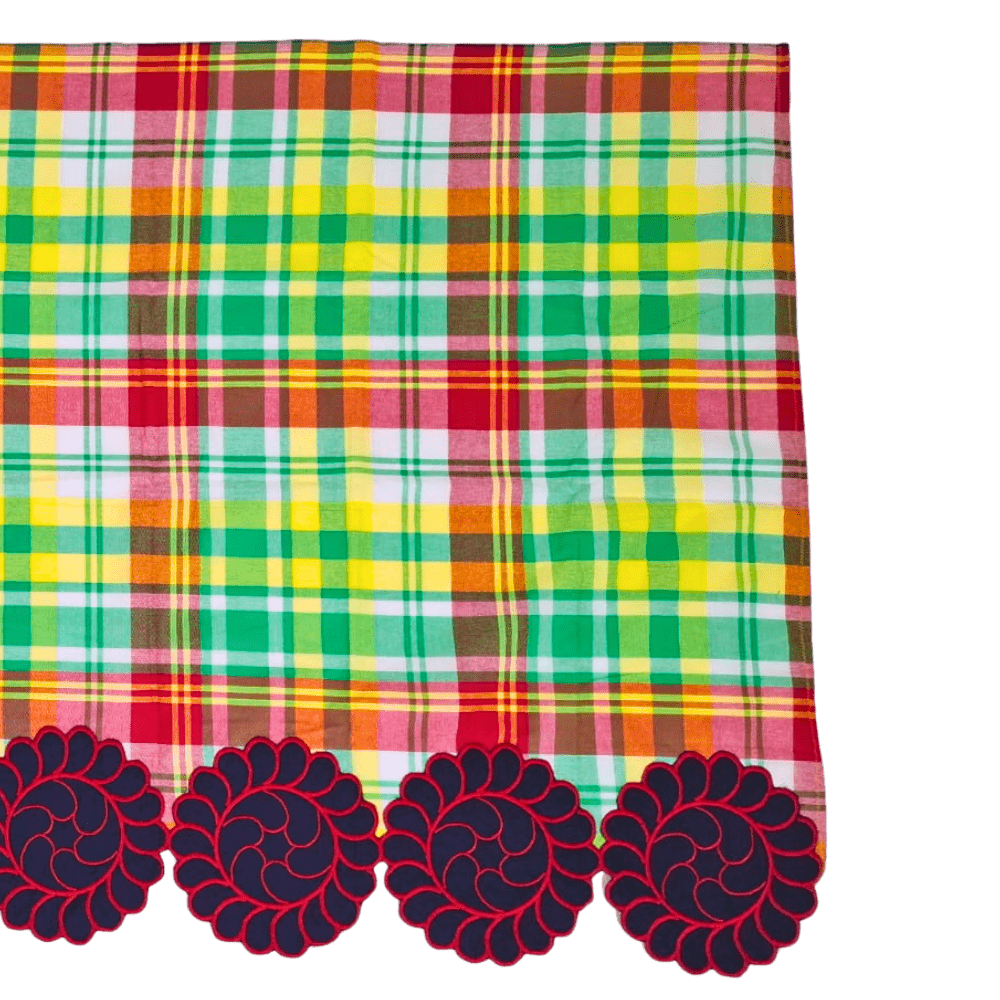 Geel-groen geruite pangi mofo met donkerblauw-roze swirlrand – Stralende traditie in volle bloei 150cm X 85cm
