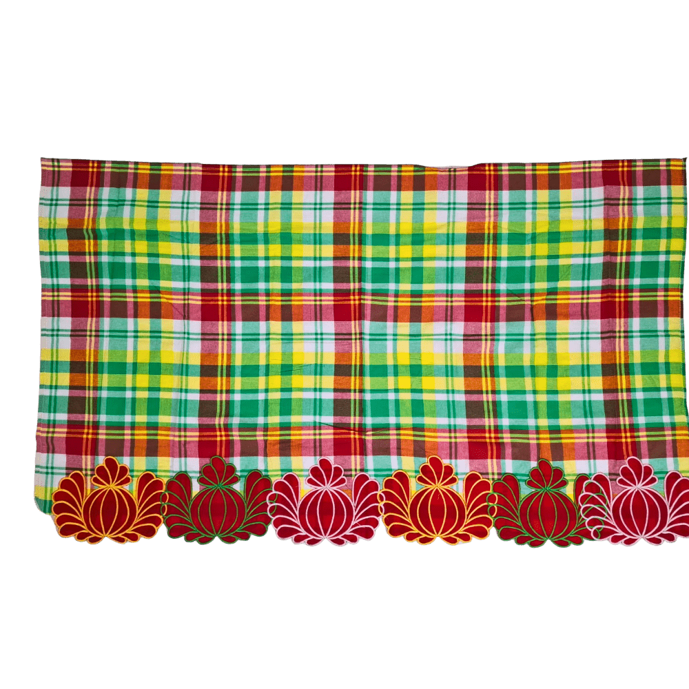 Geel-groen geruite pangi mofo met rood bloemmotief – Een ode aan bloei, balans en vrouwelijkheid 80cm X 140cm