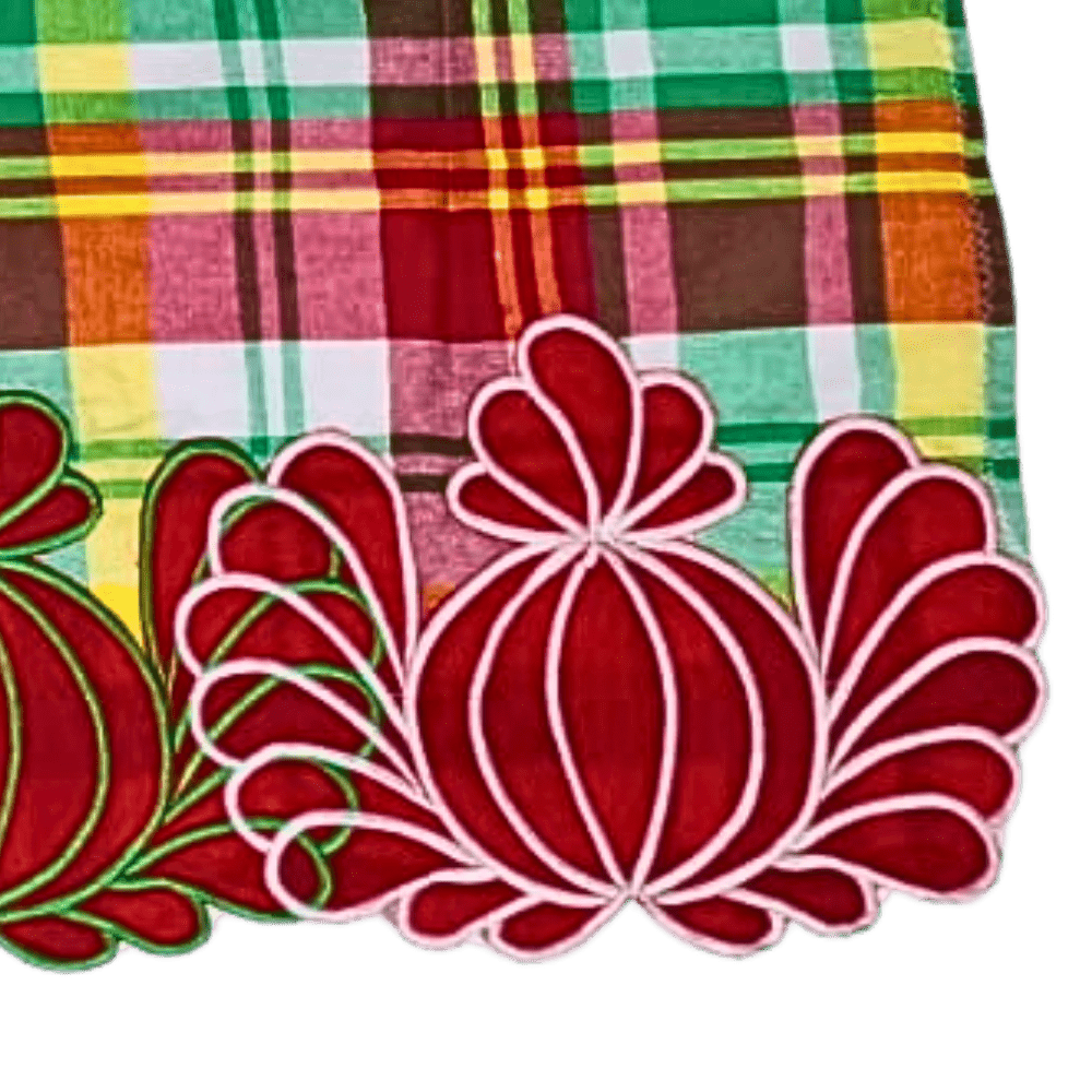 Deze stralende pangi mofo met bloemrand combineert traditie, levendigheid en betekenisvolle symboliek tot een krachtig mode-statement. De geel-groen geruite basis straalt zon en natuur uit, terwijl de indrukwekkende rand met bloemvormen in rood, wit, oranje en groen symbool staat voor bloei, harmonie en vrouwelijke trots. Dit is een doek die je niet alleen draagt, maar beleeft.